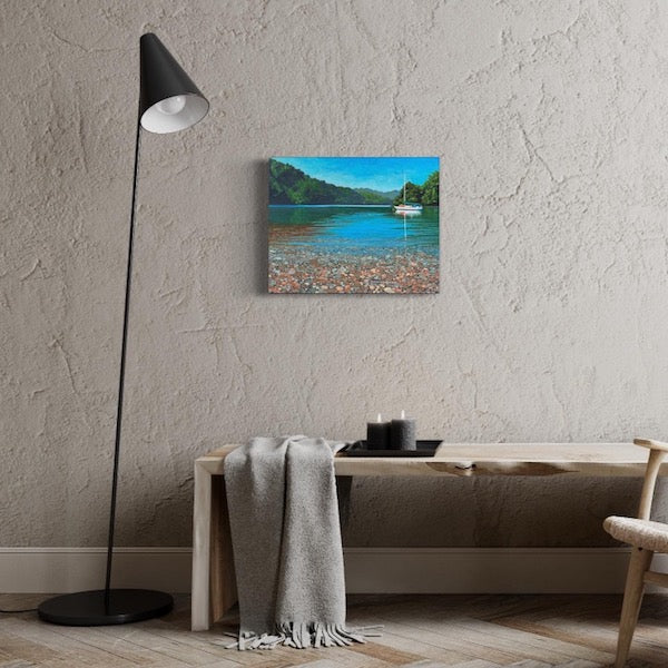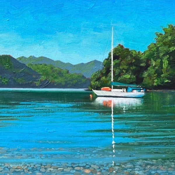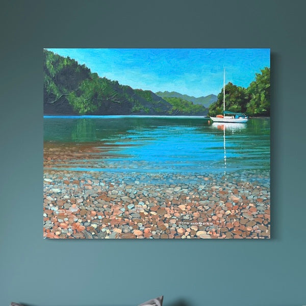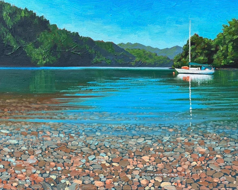 Painted from a photo taken by my brother-in-law, Tim Williams, near Picton at the top of the South Island, this place is very recognisable! I had people walk into the exhibition space and immediately identify the area. And they were Australians who had visited NZ. 40x50cm, oil on canvas, I plan to do a larger one.