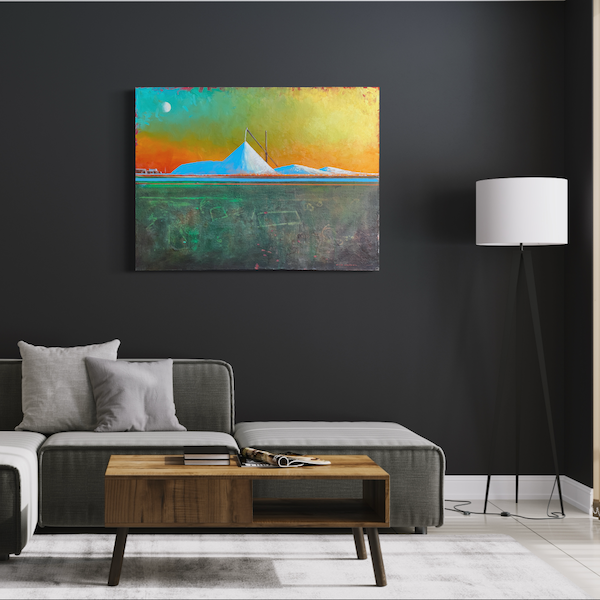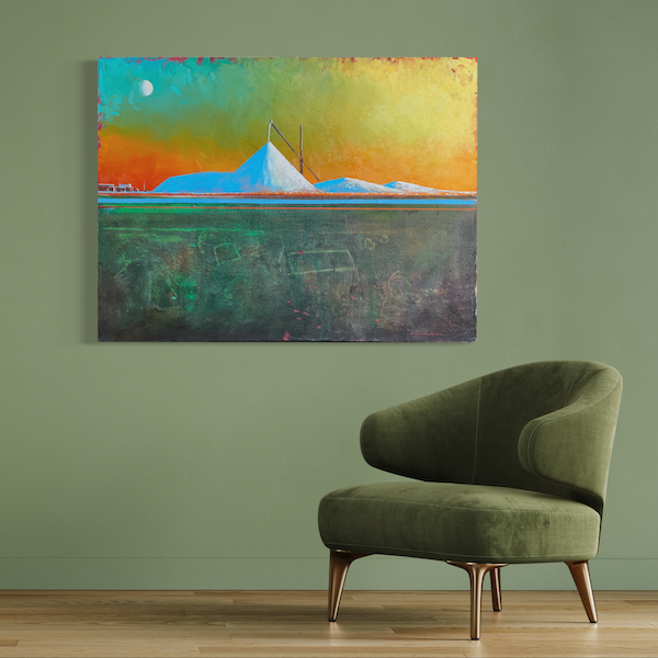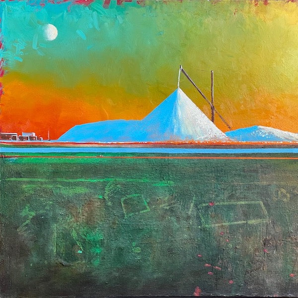 This semi abstracted rendition depicts the hot glow of evening as the moon rises over the salt. Oil on canvas, 91x121cm / 36x48". Can be viewed and purchased at the Courthouse Art Gallery, Port Hedland.
