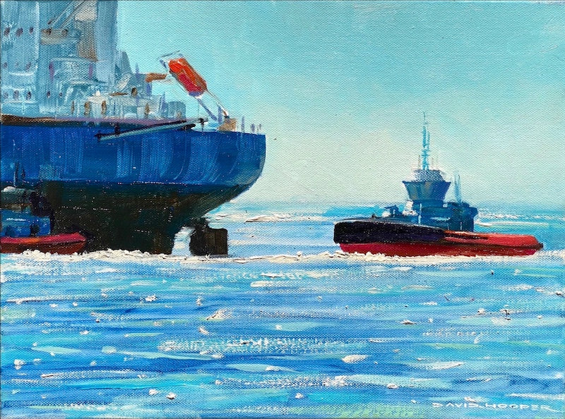 It generally take 3-5 Tugs in various positions to bring a ship into the Port Hedland Harbour. Oil on canvas, 30x40cm / 12x16" Originally in the exhibition WATER, #13.
